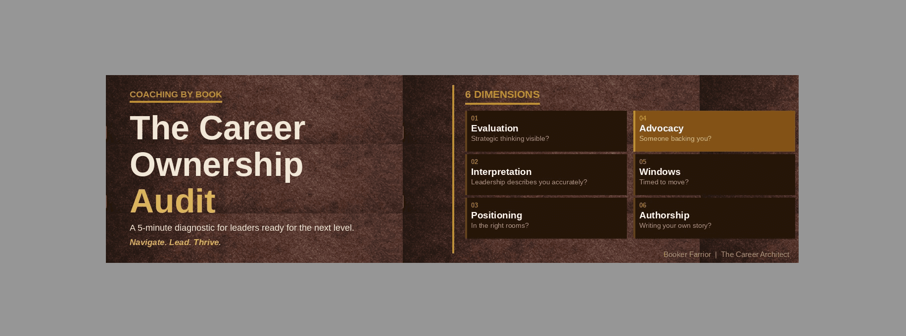 You have delivered. You have led. You have done what was asked and more. And every week, conversations happen about your future that you are not in. This audit measures how well the people in those conversations can see your value - and where the gap is quietly costing you.