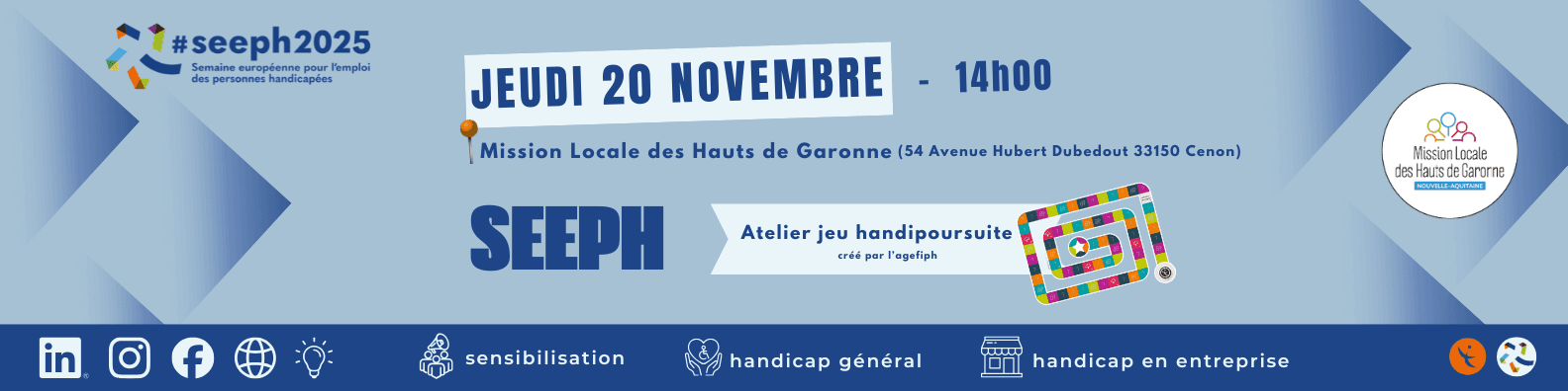➡️Dans le cadre de la SEEPH (Semaine Européenne pour l'Emploi des Personnes Handicapées), la Mission Locale des hauts de Garonne vous invite à découvrir Handipoursuite, le jeu conçu par l’Agefiph pour tester et enrichir vos connaissances sur le handicap et son intégration en entreprise.