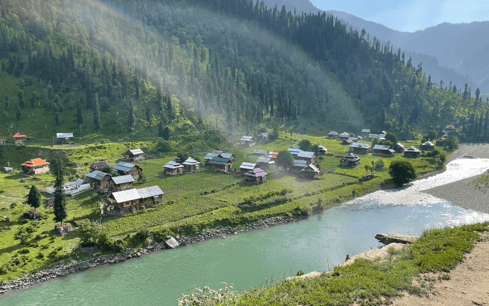 Nestled along the shimmering Neelum River, Kashmir’s villages bloom with wooden cottages, lush green fields, and towering pine-clad mountains—offering a glimpse of paradise on earth!