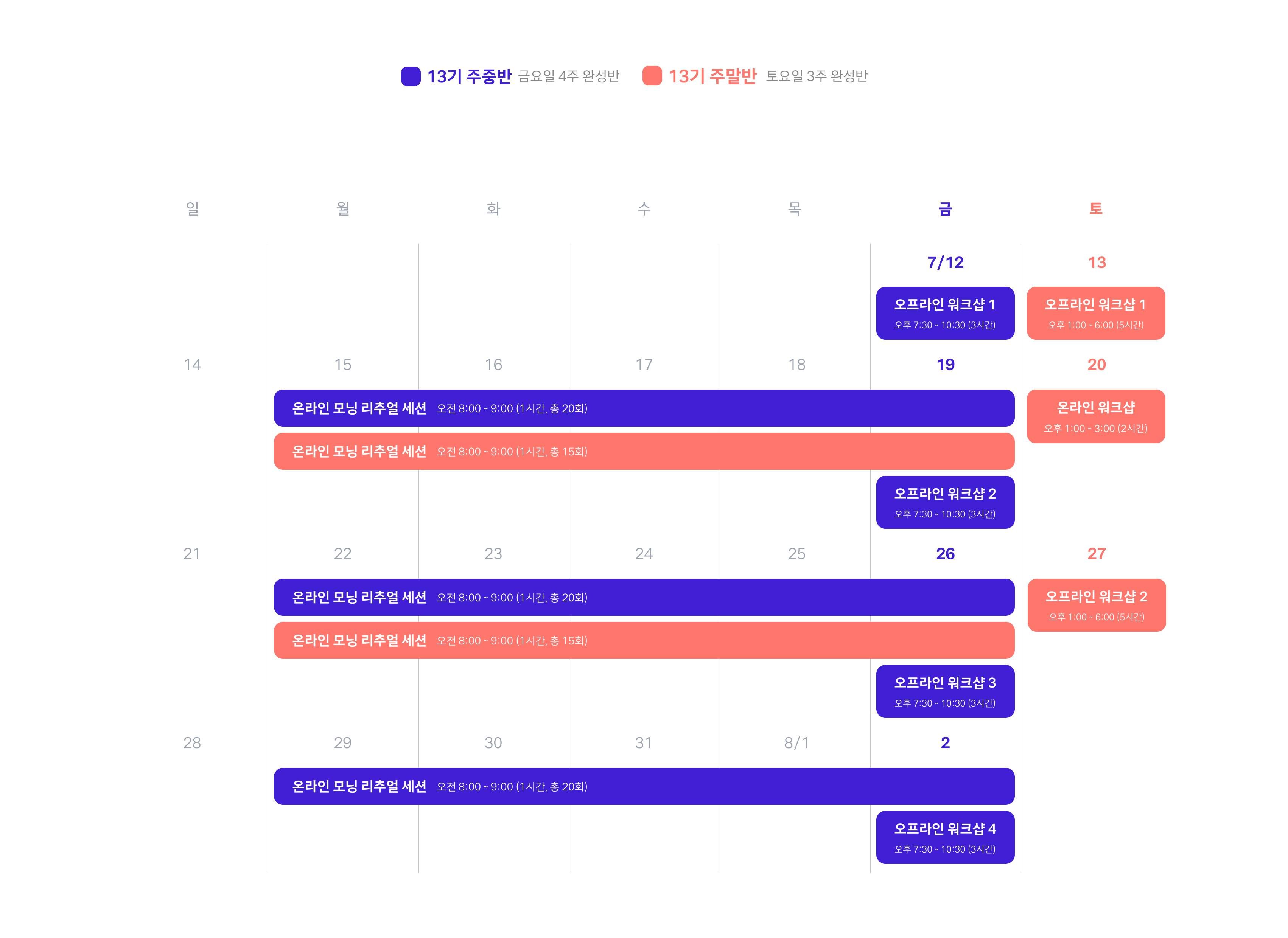 현재 i SPY i는 주중반 - 한달 과정, 주말반 - 3주 과정으로 운영되고 있습니다. 다음 예시 이미지를 참고하여 주세요.