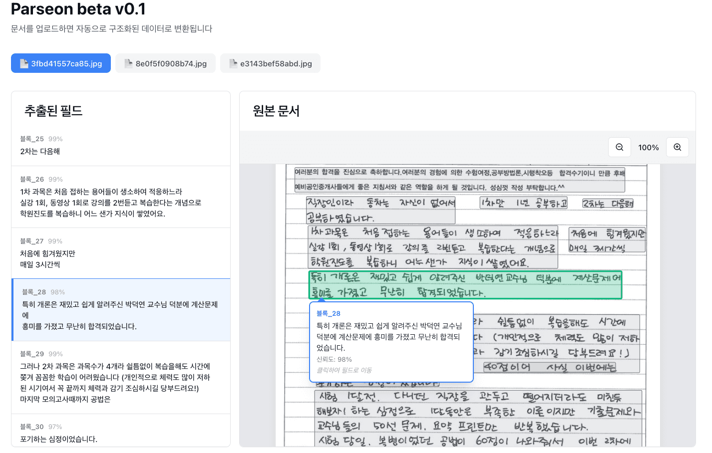 파시온(Parseon)은 기업 내부에서 안전하게 동작하는 AI 문서 자동화 솔루션입니다. 스캔본, 계약서, 인보이스 등 다양한 필기 문서를 자동으로 파싱해 구조화된 데이터로 변환합니다. 해당 데이터는 각 상황에 따라 ERP 연동, AI 에이전트 제작, 내부 데이터 정리 등에 활용하실 수 있습니다.