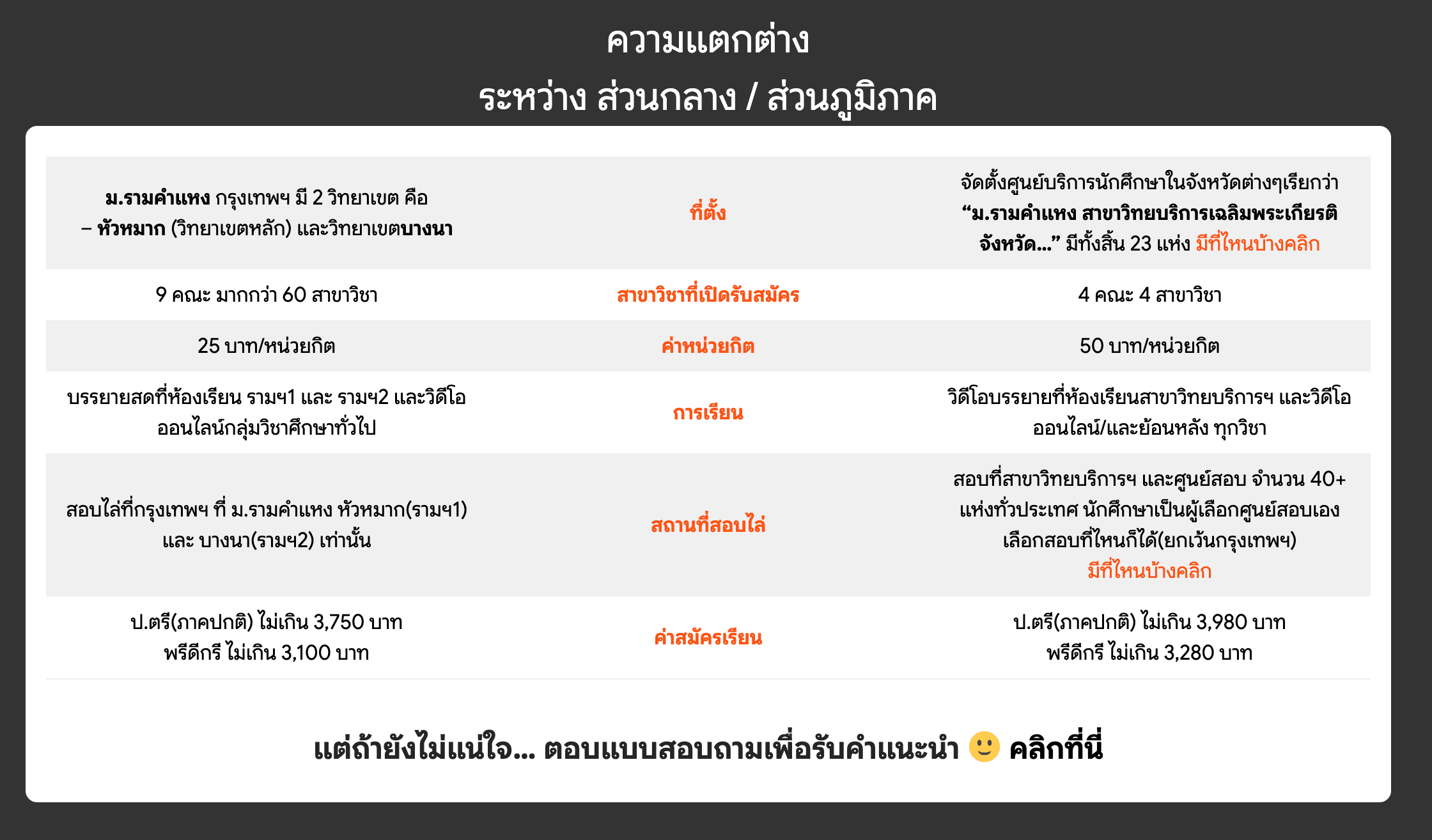 ถ้าคุณยังไม่มีข้อมูลเพียงพอที่จะตัดสินใจว่าจะเลือกสมัครเรียนที่ส่วนไหนดี ลองตอบคำถามต่อไป แล้วเราจะช่วยแนะนำข้อมูลเพิ่มเติมให้ โดยคำนึงถึงความสะดวกในการเข้าสอบไล่เป็นหลัก