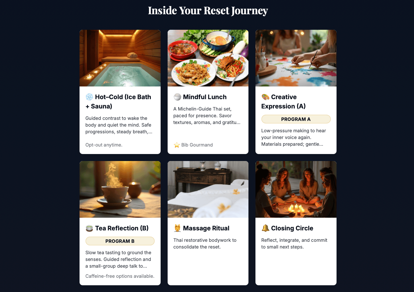 (Both editions keep the same core: Hot–Cold • Mindful Tasting • Boutique Restore. We tailor specific activities on reflection and expression for distinct focus.)